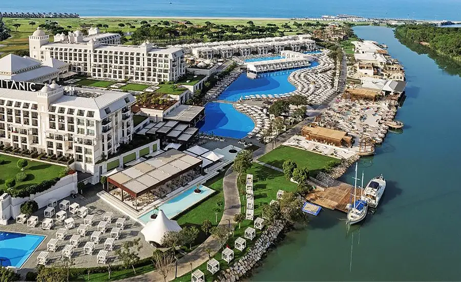 هتل تایتانیک دلوکس گلف بلک آنتالیا، در مجاورت رودخانهای در کنار جنگلهای کاج قرار گرفته و دارای ۹ استخر روباز، ۲ استخر سرپوشیده، یک پارک آبی با سرسرههای آبی متنوع و مرکز خدمات فول سرویس اسپا و تناسب اندام است. هر آنچه که یک مسافر از هتل لوکس انتظار داشته باشد، در این هتل به نحو احسن آماده و مهیا میباشد.هتل Titanic Deluxe Golf Belek Antalya تا ساحل اختصاصیاش حدود ۱ کیلومتر فاصله دارد. تمامی اتاقها مدرن هتل تایتانیک دلوکس گلف بلک شامل تلویزیون ال ای دی (LED)، سیستم تهویه مطبوع، مینی بار و بالکنهایی با منظره زیبا از باغ یا رودخانه هستند. هتل تایتانیک دلوکس گلف دارای رستوران بوفهای سلف سرویس و همچچنین بوفه مخصوص کودکان است.علاوه براین، ۴ رستوران با منوی آلاکارته دارد که انواع غذاهای ترکی، ایتالیایی و دریایی را برای گردشگران و خریداران آماده و طبخ میکنند. این هتل شامل خدمات باکیفیت All inclusive است و انواع غذاها، رستورانها و انواع نوشیدنیهای را ارائه میدهد. برای رفاه بیشتر مسافران هتل خدماتی چون صبحانه در اتاق نیز ارائه میشود.این هتل با وجود امکاناتی چون فکس، فتوکپی و اتاق جلسات برای سفرهای کاری شما مناسب است. برای تجربه یک سفر خاطر انگیز میتوانید فعالیتهایی چون گلف، ماهی گیری، دارت، بیلیارد، پینگ پونگ و دوچرخه سواری را در هتل Titanic Deluxe Golf Belek تجربه کنید.